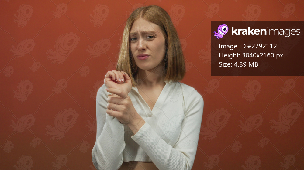 Young woman with blonde hair wearing a white shirt holds her wrist, standing against an isolated red wall, expressing discomfort.