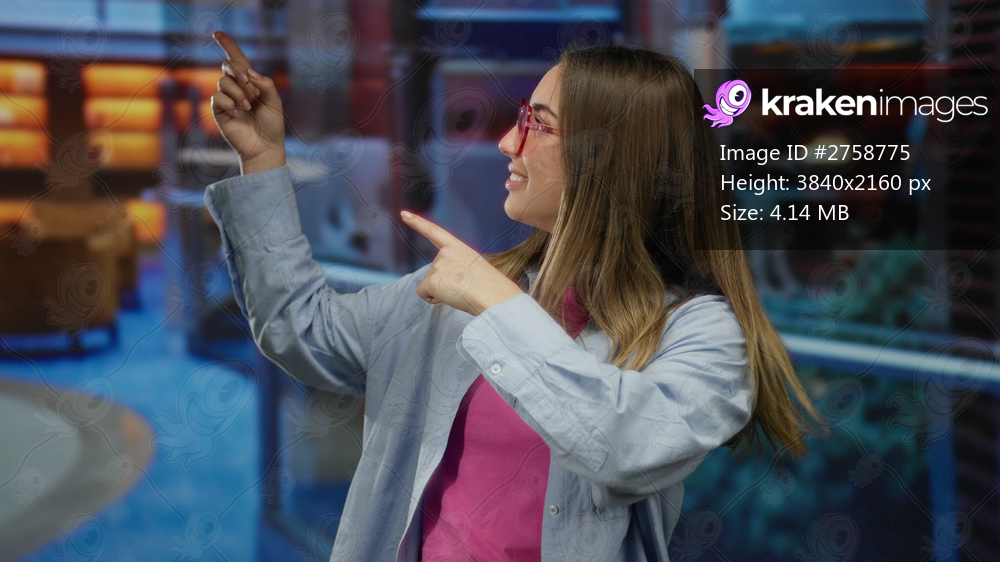 Young woman with blonde hair wearing pink sunglasses and pointing excitedly in a modern hotel indoor setting with stylish decor and blue carpet.