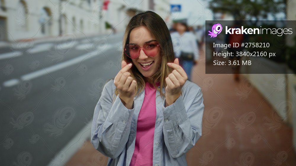 Young woman with blonde hair wears pink glasses and smiles joyfully on a street, making a heart gesture with her fingers, embodying outdoor happiness and vibrant energy. - Kraken Images