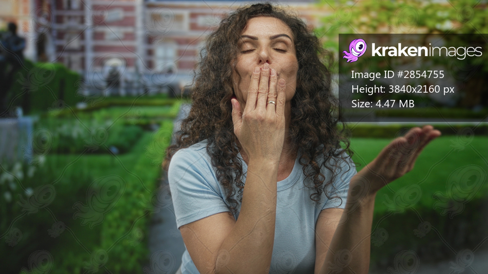 Young woman blows a kiss with finger to lips in green sunny park near building; affection romance.