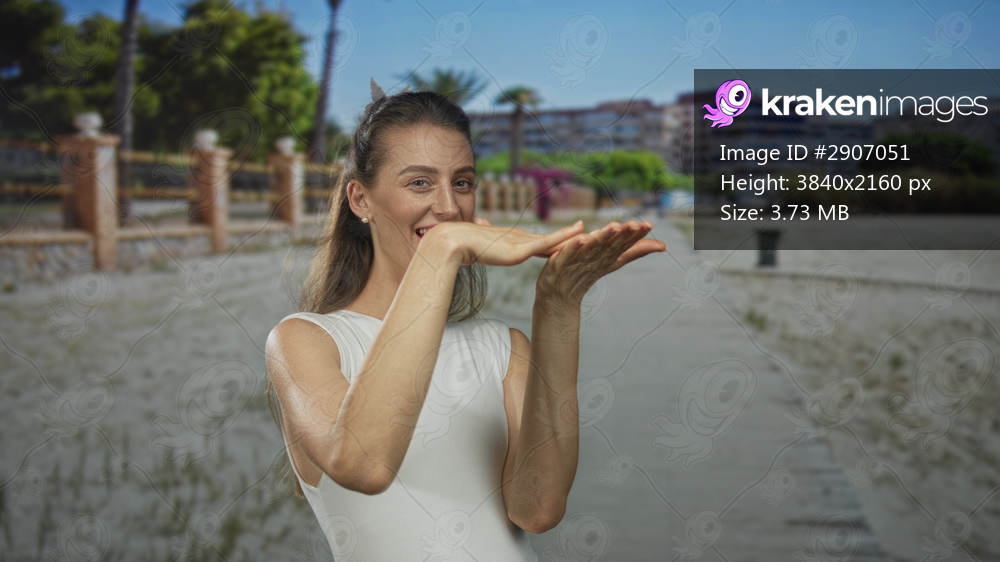Young woman blows kiss with cupped hands on a sunny street by beachfront buildings, smiling broadly; joy playfulness warmth.