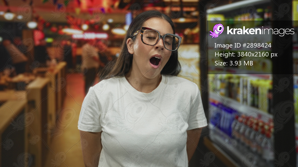 Young woman blows kiss with hand in restaurant building aisle, wearing white t shirt and large glasses; playful affection.