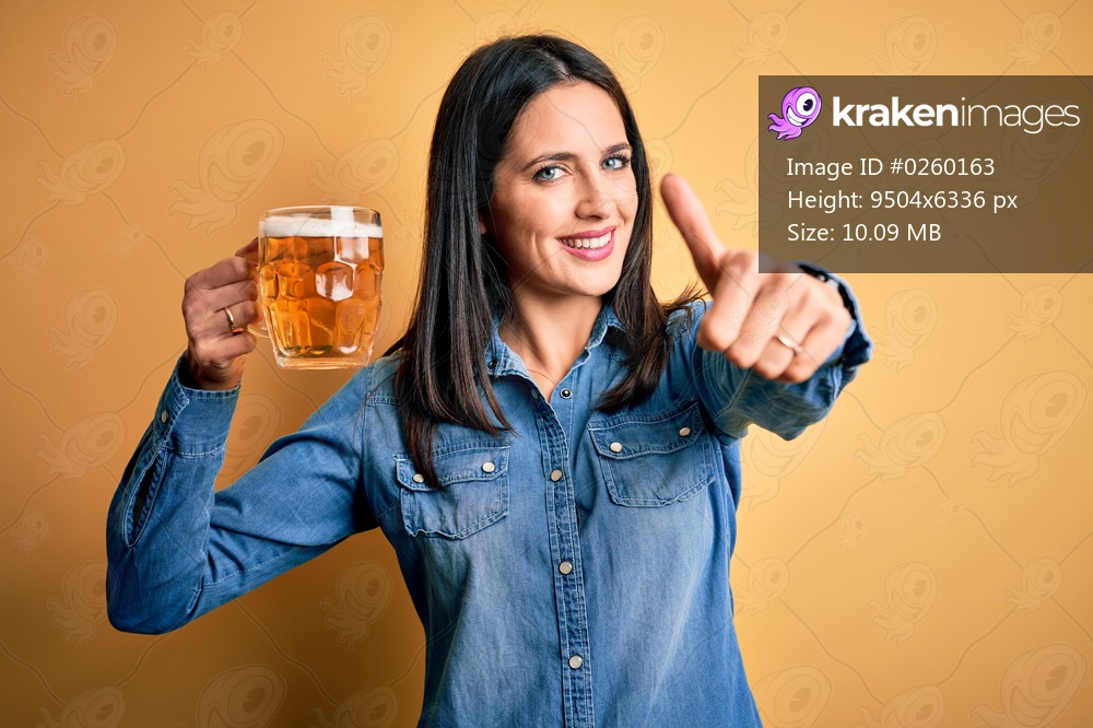 Young woman with blue eyes drinking jar of beer standing over isolated yellow background approving doing positive gesture with hand, thumbs up smiling and happy for success. Winner gesture. - Kraken Images