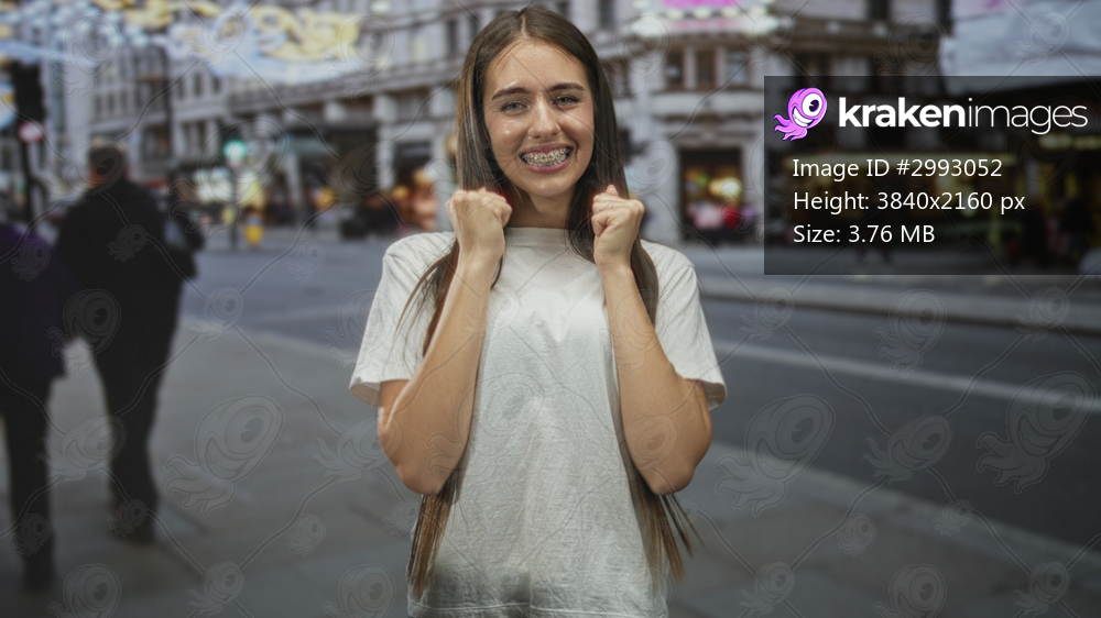 Young woman with braces smiling and raising clenched fists in victory on a busy street lined with shops and blurred pedestrians; youthful joy.