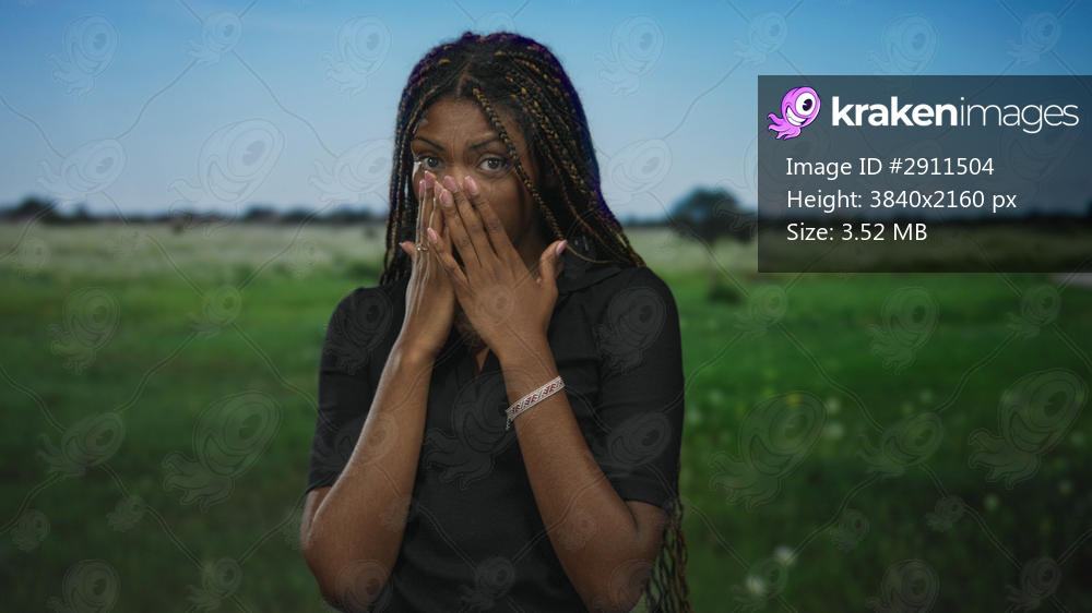 Young woman with braided hair covers mouth with both hands in forest meadow under blue sky; surprise introspection.