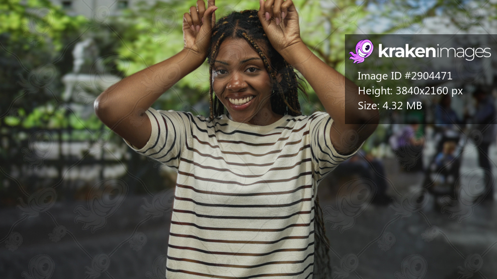 Young woman with braided hair and hands to head smiling on city street near fountain and stroller; joyful playful confidence.