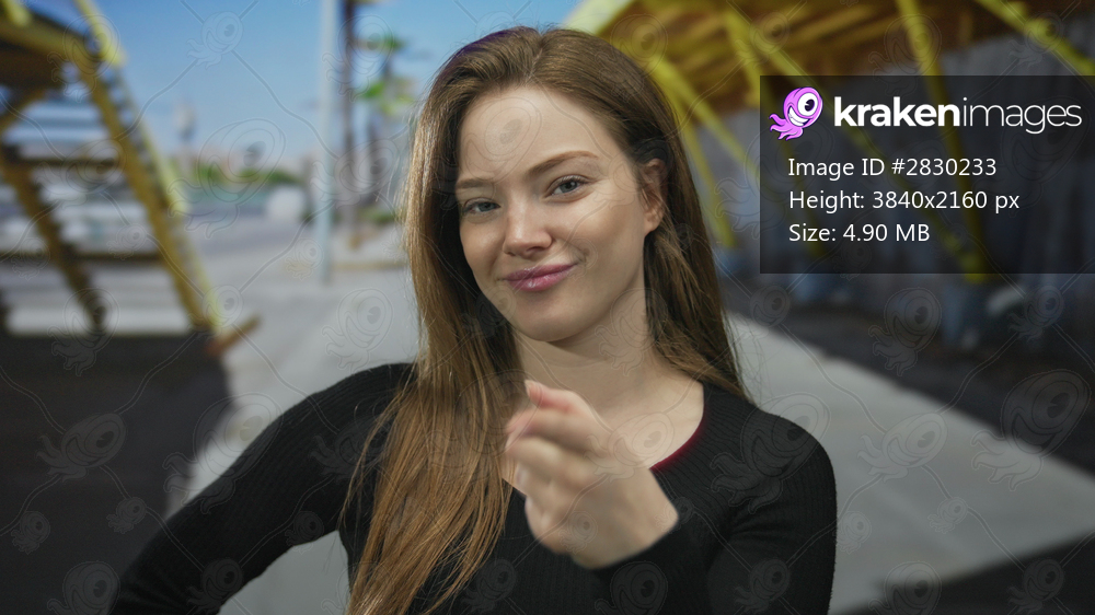 Young woman with brown hair finger pointing to scaffolding on street while wearing black sweater; confidence.