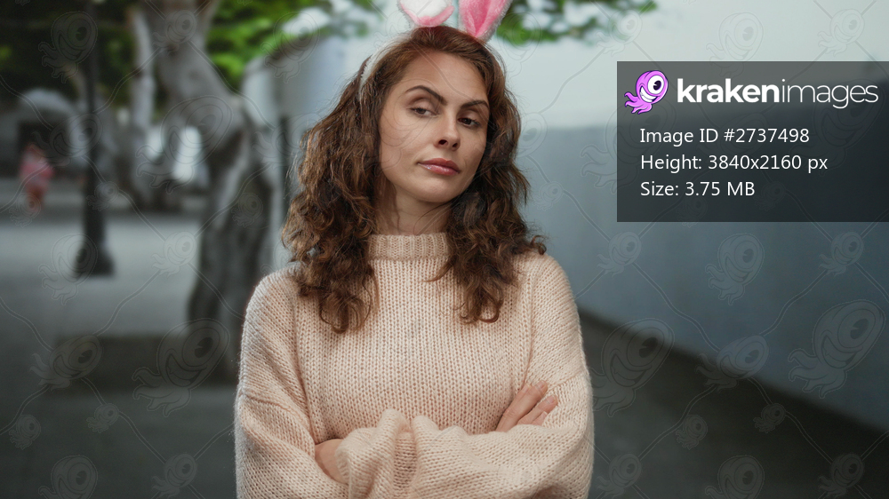 Young woman with bunny ears standing in a city street outdoors with arms crossed, wearing a cozy sweater, showing expression against blurred urban background with trees. - Kraken Images