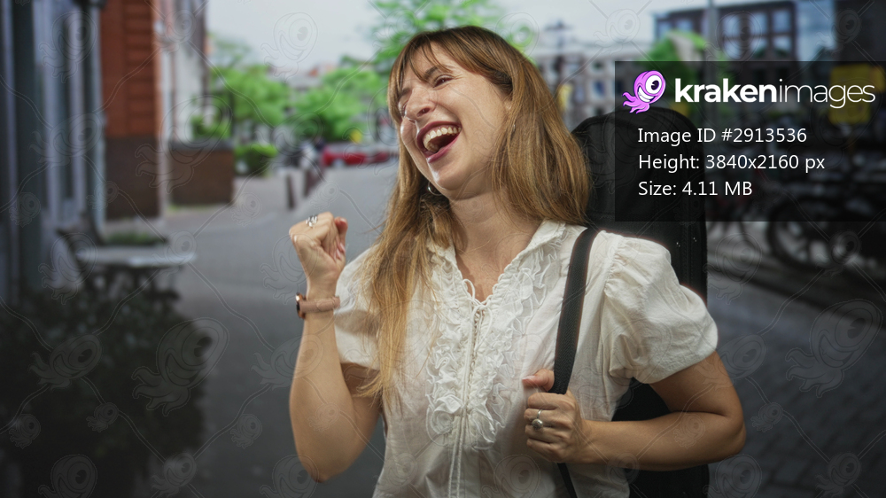 Young woman carrying a guitar case and pumping a clenched fist on a cobblestone city street beside parked bicycles and outdoor cafe seating; triumph joy. - Kraken Images