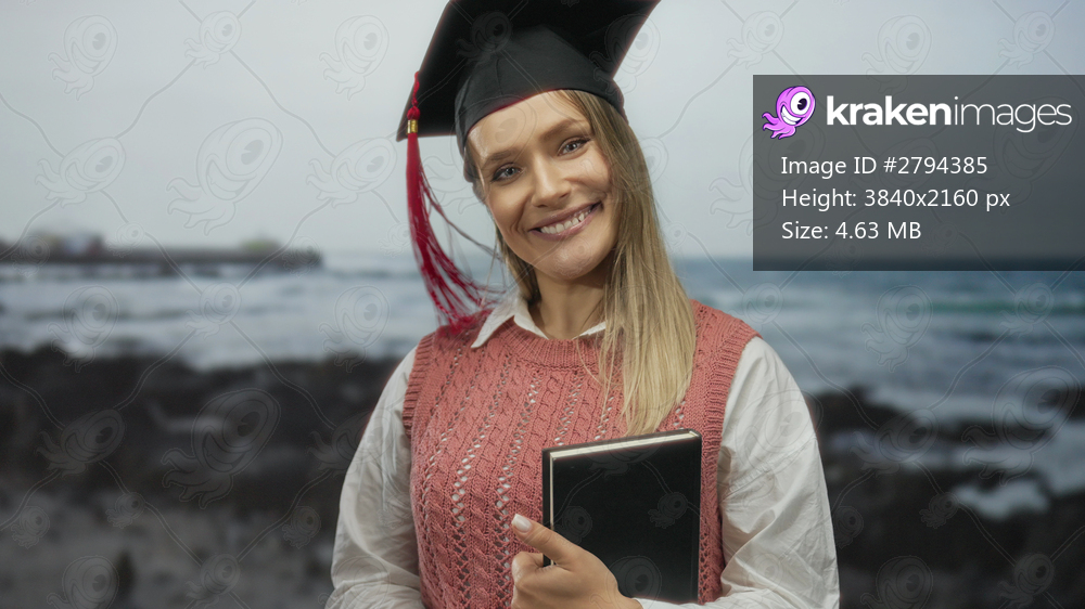 Young woman celebrating graduation at seaside holding book with blonde hair and cap smiling outdoors at the beach with ocean waves in the background