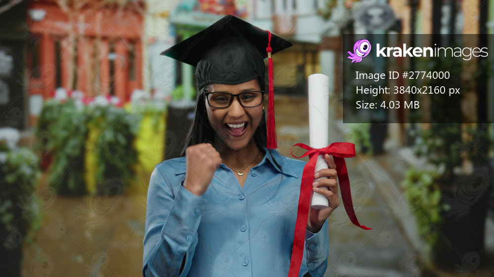 Young woman celebrating graduation outdoors, holding diploma wrapped with red ribbon while wearing cap and gown, expressing joy and achievement on a vibrant city street. - Kraken Images