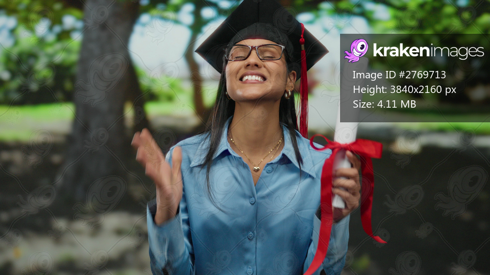 Young woman celebrating graduation outdoors in a park setting, wearing a cap and gown while holding a diploma and smiling with happiness and pride.