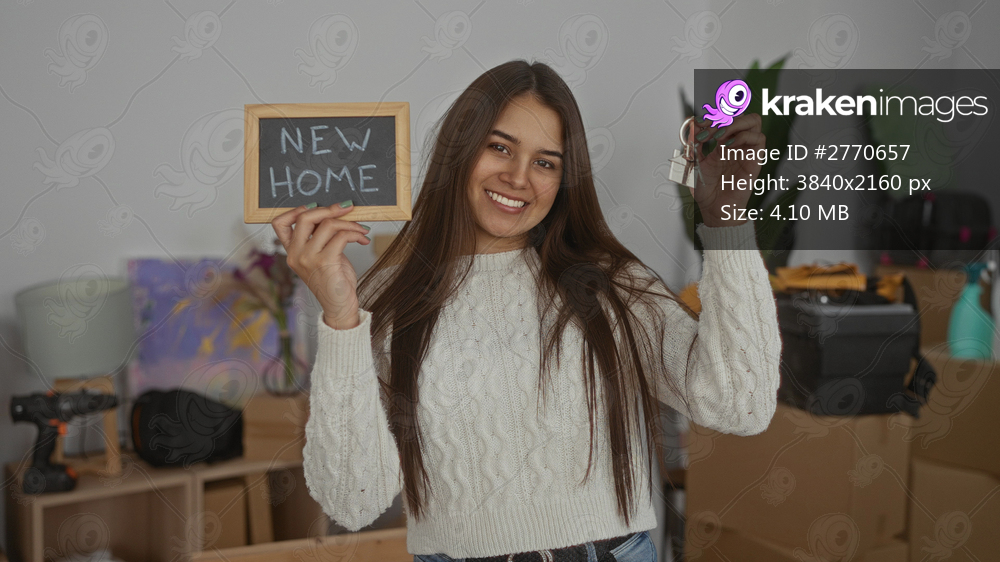 Young woman celebrating new home in modern living room holding keys and sign symbolizing fresh start and achievement indoors surrounded by moving boxes and houseplants smiling happily. - Kraken Images