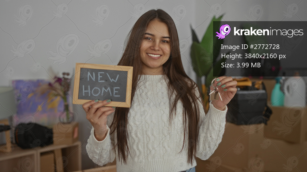 Young woman celebrating new home in modern living room holding keys and sign symbolizing fresh start and achievement indoors surrounded by moving boxes and houseplants smiling happily. - Kraken Images