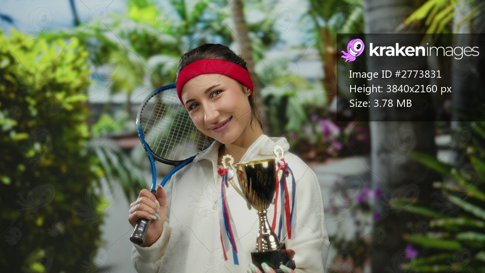 Young woman celebrating tennis victory holding trophy and racket in lush green outdoor park setting with vibrant plants and trees showcasing her achievement and happiness. - Kraken Images