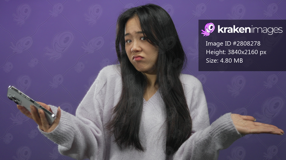 Young woman with cellphone against purple background appearing confused isolated indoors
