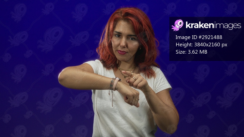 Young woman checking watch and pointing to wrist in studio with deep blue backdrop; impatience time awareness.