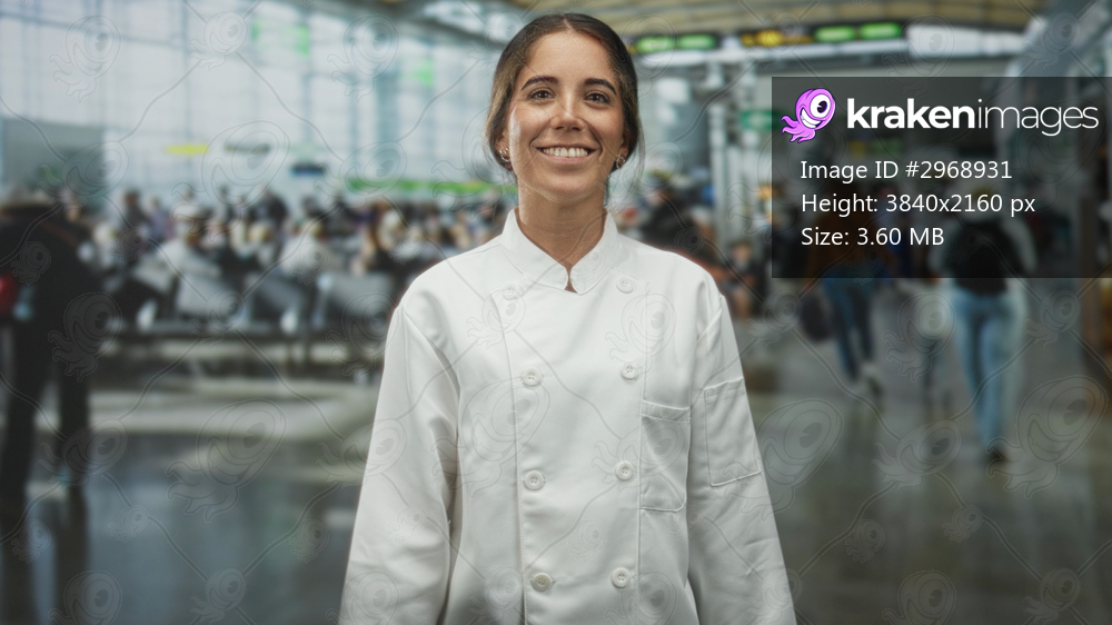 Young woman chef with arms crossed, smiling in white chef coat, standing in busy airport terminal with passengers and seating visible; confidence.