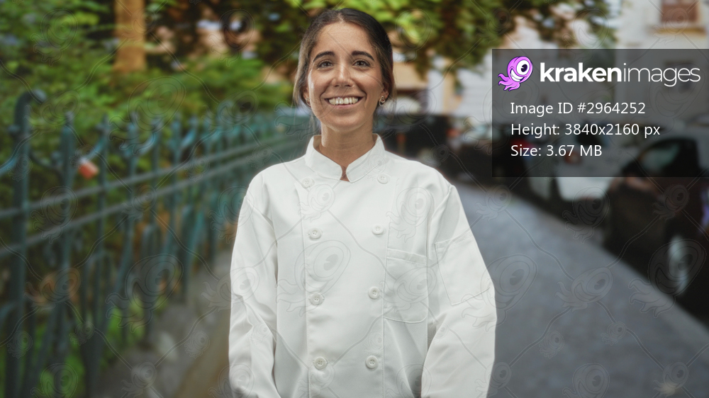 Young woman chef with clenched fists and raised hands on a street smiling in white jacket; triumph success gratitude.