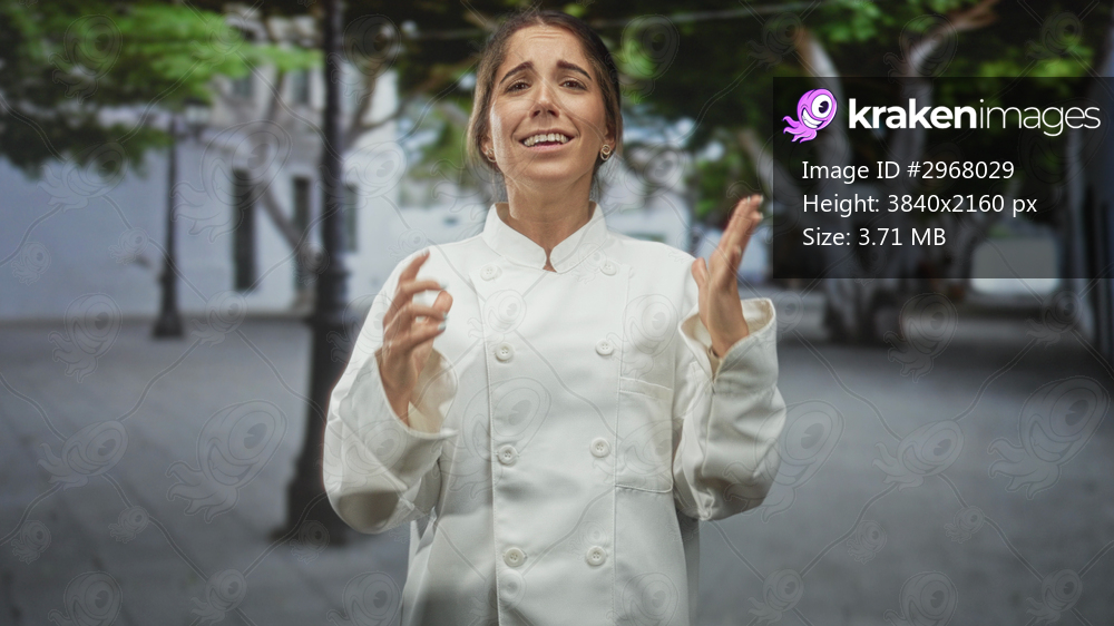 Young woman chef with hands raised and mouth open shouting on a street; frustration pressure urgency.