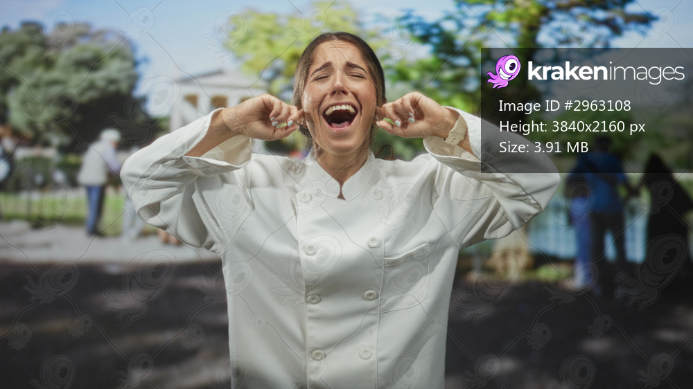 Young woman chef with hands to head and mouth open, laughing on a street near a park pond and trees; joy release.