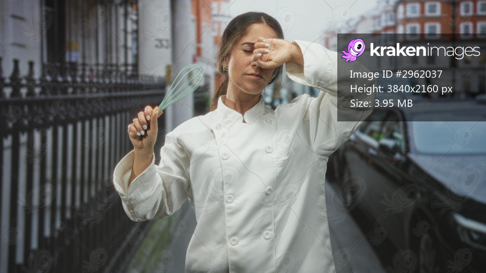 Young woman chef holding a whisk and raising her hand while rubbing her eye on a city street; fatigue.