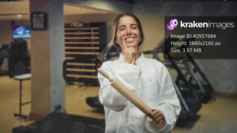 Young woman chef holding a wooden rolling pin, finger to chin gesture in a gym building; playful curiosity.