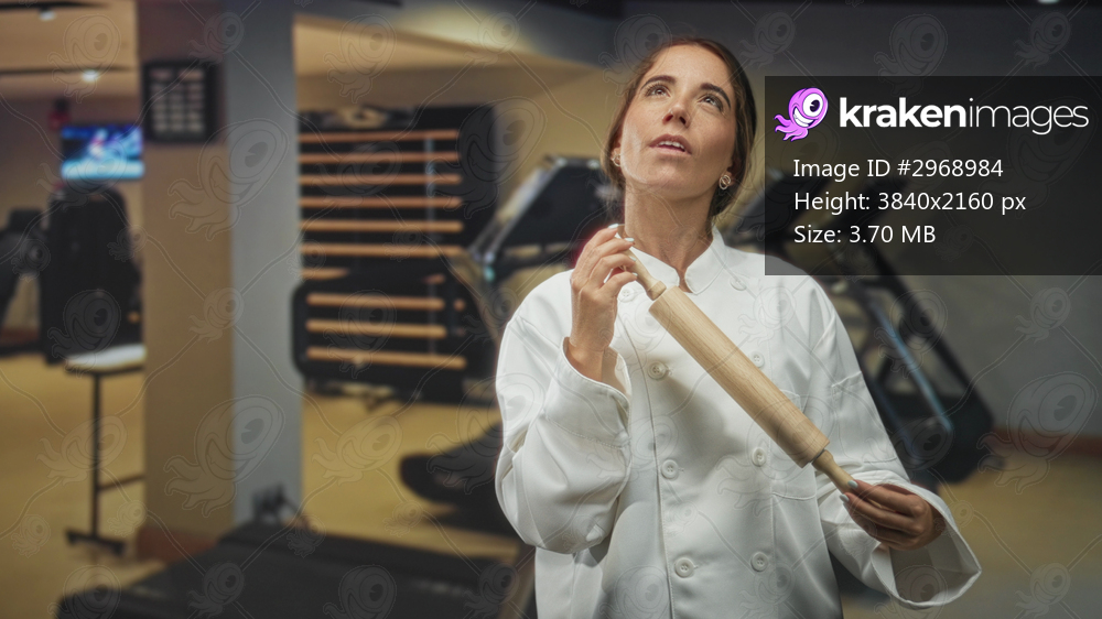 Young woman chef holding a wooden rolling pin, finger to chin gesture in a gym building; playful curiosity.