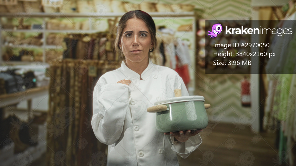 Young woman chef holding green pot with wooden handles, hand to chest and puzzled expression in building store aisle; uncertainty.