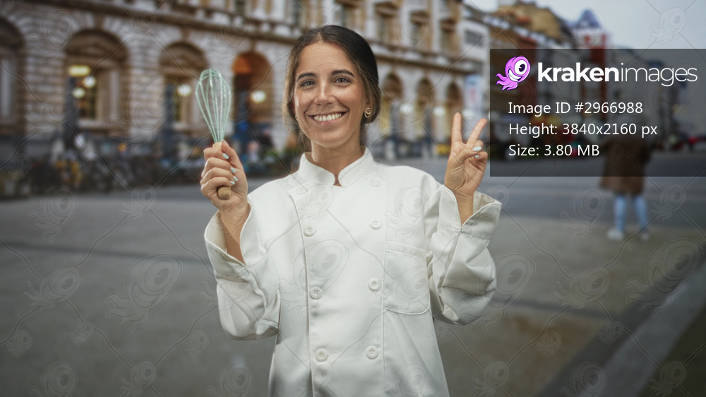 Young woman chef holds a whisk and flashes a two finger peace sign with her hand on a city street; joy.