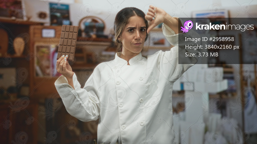 Young woman chef in white coat holds a large chocolate bar aloft with her right hand while posing amid shop shelves in a building; confidence.