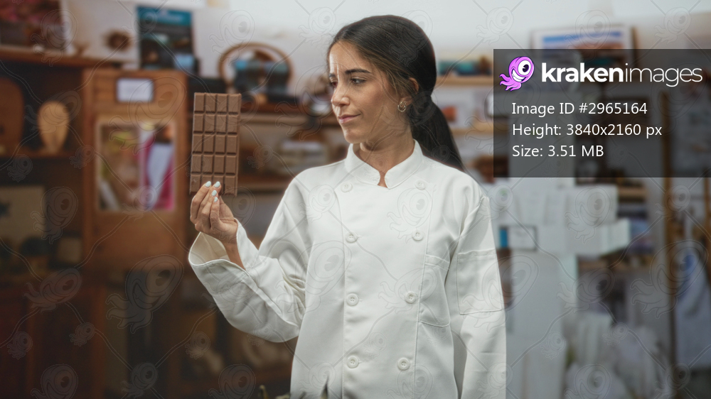 Young woman chef in white coat holds a large chocolate bar aloft with her right hand while posing amid shop shelves in a building; confidence.