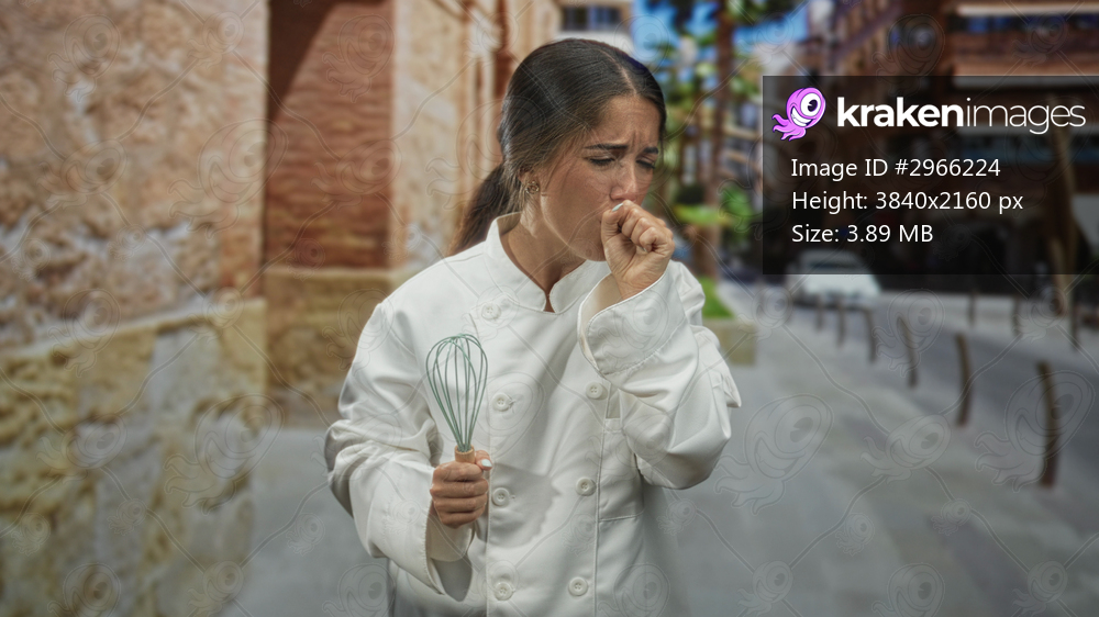 Young woman chef in white coat holds a whisk, pinches her nose and grimaces on a street lined with stone buildings; odor disgust.