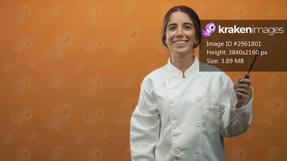 Young woman chef in white coat holds metal grater in right hand while raising left hand palm up in a tasting gesture against orange backdrop in studio; confidence. - Kraken Images