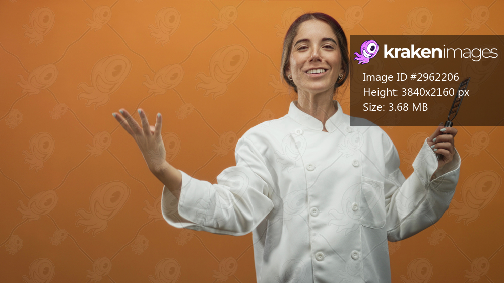 Young woman chef in white coat holds metal grater in right hand while raising left hand palm up in a tasting gesture against orange backdrop in studio; confidence. - Kraken Images