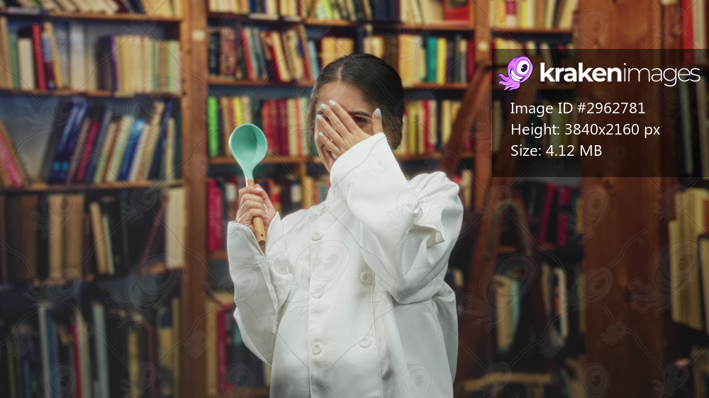 Young woman chef in white coat holds turquoise ladle and covers mouth with hand while smiling amid bookshelves in a library building; playful joy.
