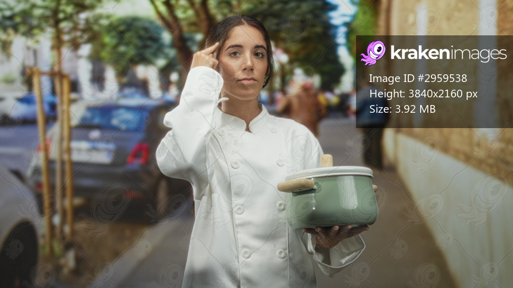 Young woman chef in white coat points finger forward while holding a green pot on an urban street, pedestrians and parked cars visible; determination leadership. - Kraken Images