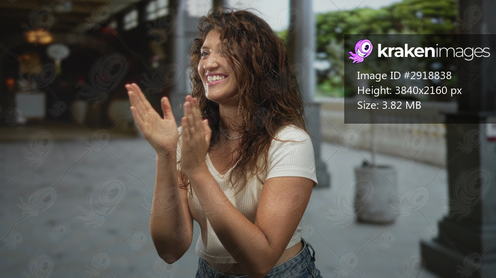 Young woman clapping hands in a covered building walkway, smiling broadly, wearing white crop top and jeans, midriff visible; joy celebration.