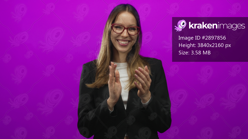 Young woman clapping hands in studio wearing red glasses and black blazer against vivid purple wall; joy appreciation.