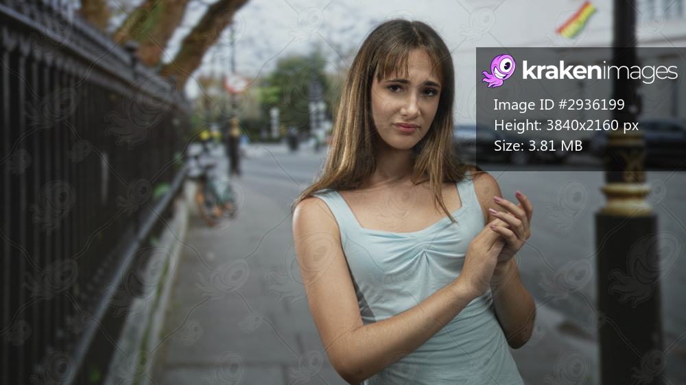 Young woman clapping hands on city street by iron railing in pale blue top with unimpressed expression; indifference irony.