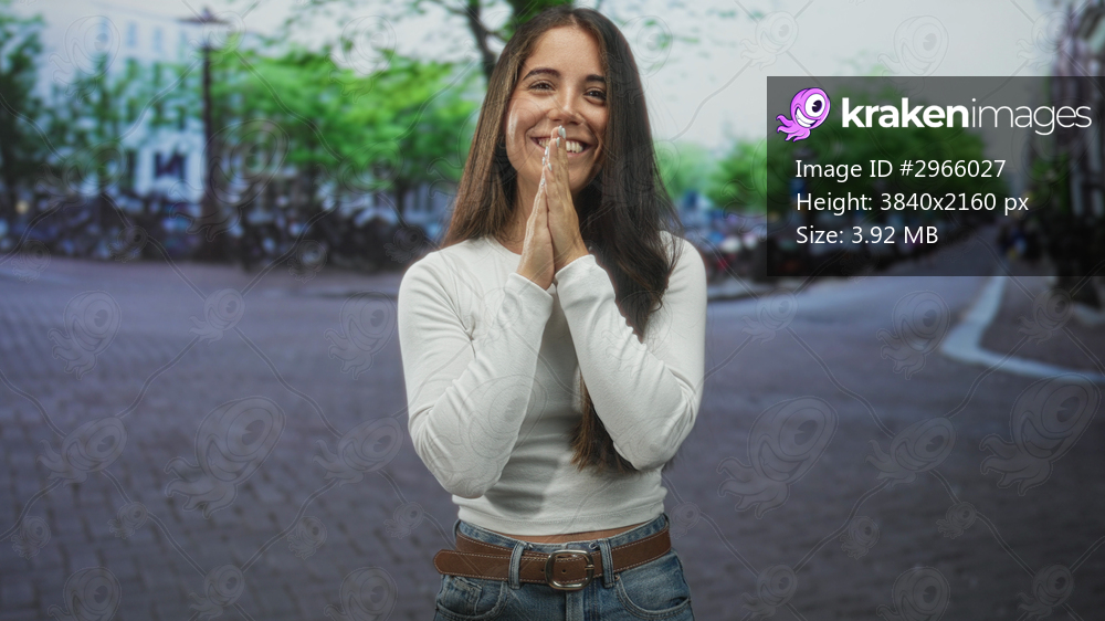 Young woman claps hands and smiles on a tree lined city street by parked bikes, wearing white top and jeans; joy gratitude.