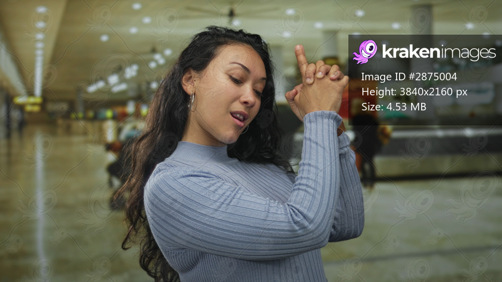 Young woman clasping hands near face and smiling broadly at camera in busy airport terminal wearing blue sweater; joy travel reunion.