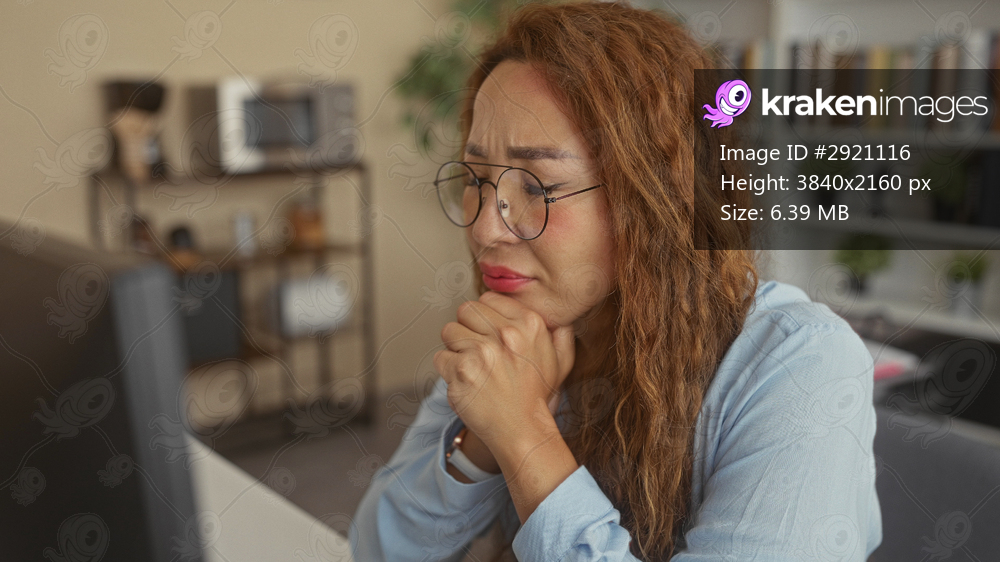 Young woman clasping hands under chin at office desk, wearing glasses and light blue shirt, looking at monitor; work concern.