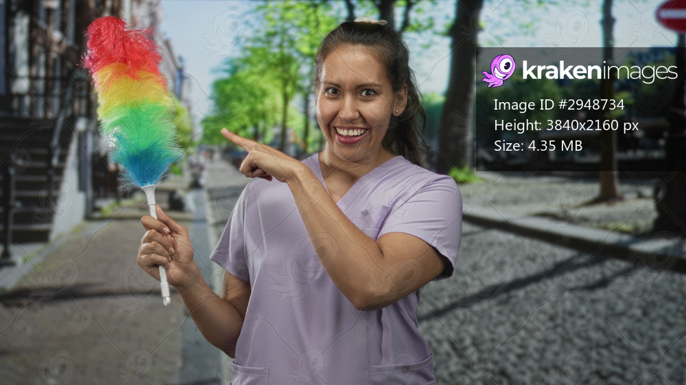 Young woman cleaner smiling points finger to rainbow duster while holding it in one hand on cobblestone city street; cheerful moment.