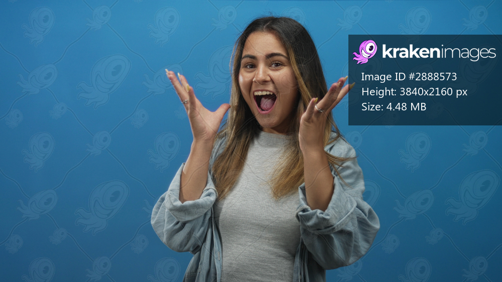 Young woman with clenched fists and closed eyes smiling, hands raised wearing gray top and denim shirt in blue studio; joy.