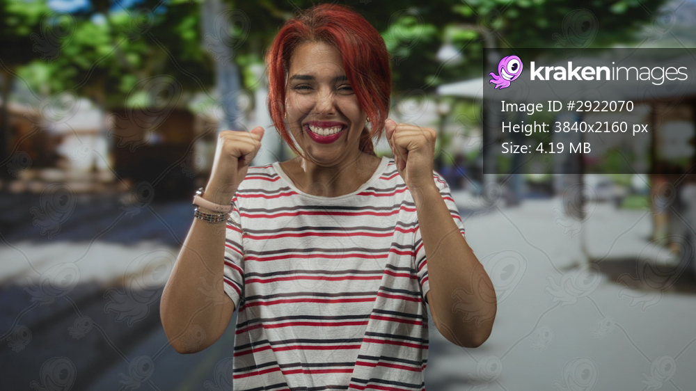 Young woman with clenched fists and closed eyes smiling on street near cafe umbrellas wearing a striped shirt; joy celebration.