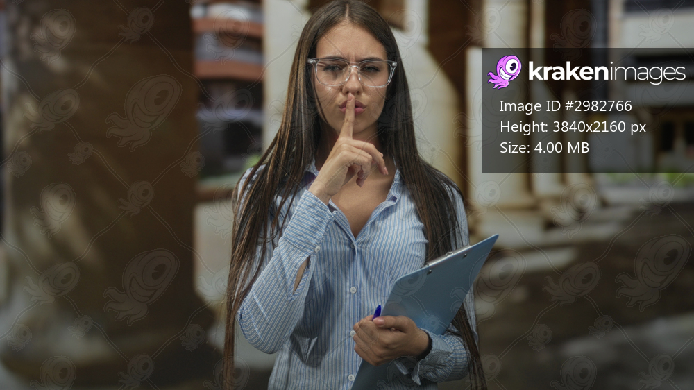 Young woman with clipboard and glasses, finger to lips for silence in building corridor, striped shirt and long hair; quiet secrecy.