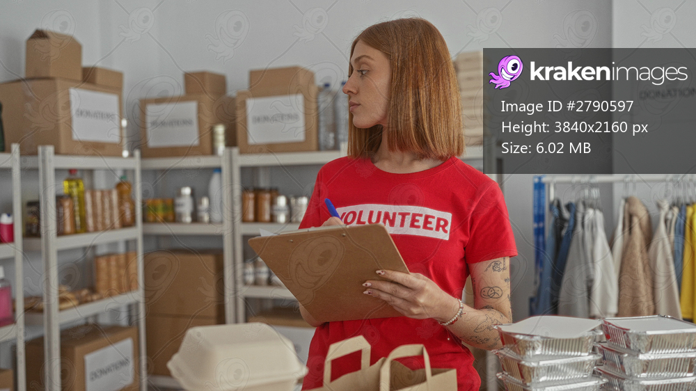 Young woman with clipboard in volunteer center organizing donations in indoor room wearing red shirt surrounded by supplies and boxes