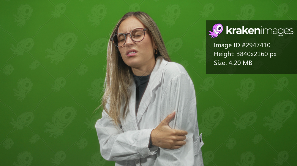 Young woman clutching arm in white lab coat and glasses against a green studio backdrop; injury pain.
