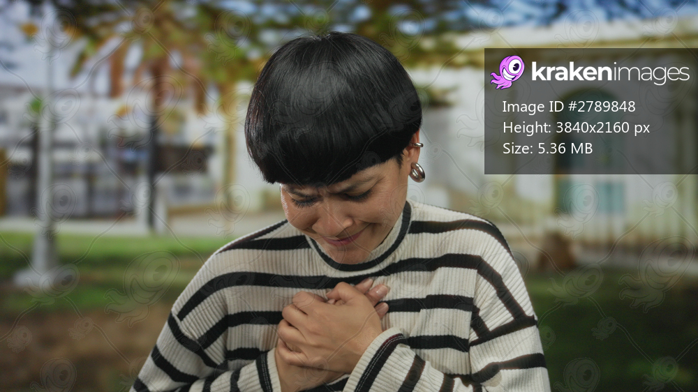 Young woman clutching chest outdoors shows discomfort with blurred background.